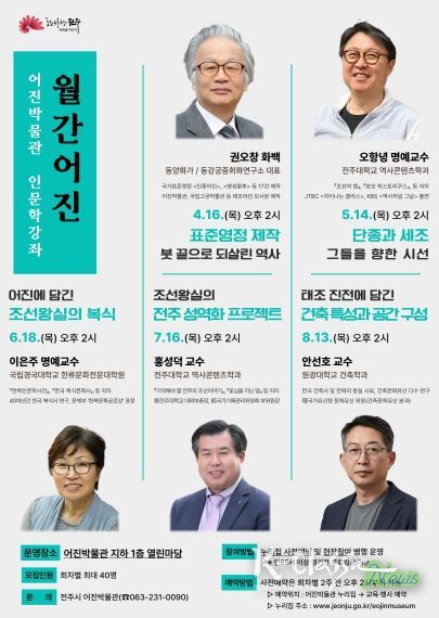 K-Classic News 기자 | 전주시 어진박물관은 4월부터 오는 8월까지 매월 셋째 주 목요일 인문학 강좌인 ‘월간어진’을 운영한다고 10일 밝혔다.