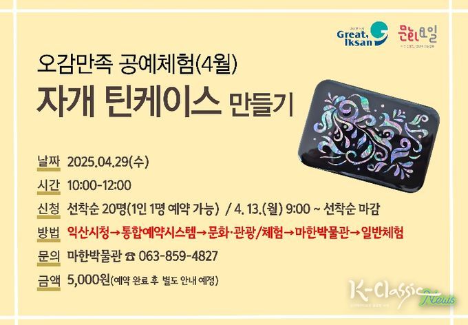 K-Classic News 기자 | 익산시는 마한박물관에서 오는 29일 문화가 있는 날을 맞아 '자개 틴케이스 만들기' 체험을 운영한다고 10일 밝혔다.