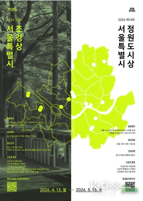 K-Classic News 기자 | 서울시는 도시경관 개선에 기여한 우수 조경공간과 시민참여 정원 사례를 발굴·확산하기 위해 '2026 서울특별시 조경상·정원도시상' 공모를 4월 13일부터 5월 13일까지 진행한다고 밝혔다.