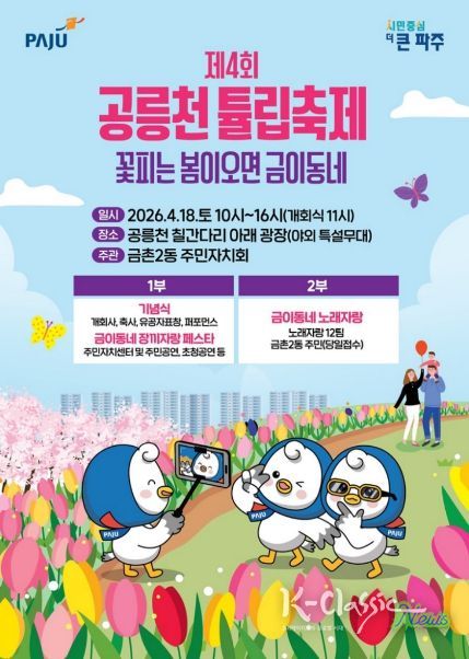 K-Classic News 기자 | 파주시 금촌2동 주민자치회는 오는 18일 공릉천 칠간다리 아래 광장에서 '제4회 공릉천 튤립축제'를 개최한다.
