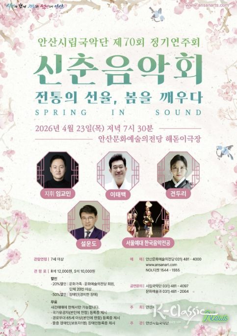 K-Classic News 기자 | 안산시는 오는 23일 오후 7시 30분 안산문화예술의전당 해돋이극장에서 안산시립국악단 제70회 정기연주회 '신춘음악회 SPRING IN SOUND'를 개최한다고 13일 밝혔다.
