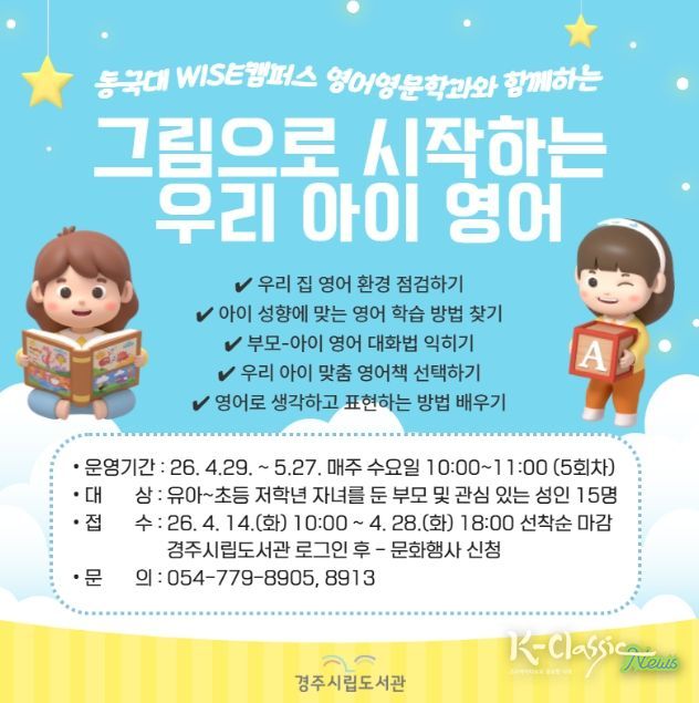 K-Classic News 기자 | 경주시 시립도서관은 지역대학과의 협업을 통해 시민들에게 실생활 중심의 영어교육 기회를 제공하고자 동국대학교 WISE캠퍼스 영어영문학과와 함께 ‘그림책으로 시작하는 우리 아이 영어’ 강좌를 운영한다.