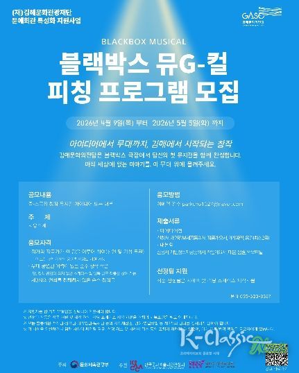 K-Classic News 기자 | (재)김해문화관광재단(대표이사 최석철) 김해문화의전당은 2026 문예회관 특성화 지원사업의 일환으로 ‘블랙박스 뮤G컬’ 피칭 프로그램을 운영하고 창작뮤지컬 초연으로 이어지는 30분 리딩 쇼케이스의 작품 공모를 진행한다.