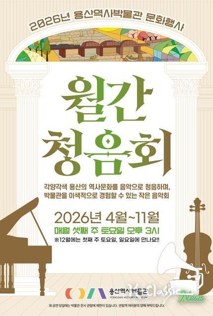 K-Classic News 기자 | 서울 용산구가 이달부터 11월까지 매월 셋째 주 토요일, 12월은 첫째 주 토요일과 일요일 오후 3시에 용산역사박물관(한강대로14길 35-29) 로비에서 작은 음악회 ‘월간 청음회’ 문화 행사를 개최한다.