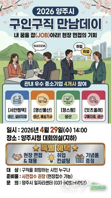 행사는 오는 4월 29일 오후 2시부터 4시까지 양주시청 대회의실에서 진행되며, 구직자는 사전 신청 또는 행사 당일 오후 1시 30분부터 현장 접수 후 면접에 참여할 수 있다. 참여를 희망하는 구직자는 이력서 등 지원 서류를 지참해야 한다.