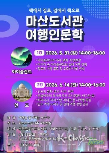 K-Classic News 기자 | 김포시 마산도서관이 오는 5월 31일과 6월 14일 오후 2시부터 4시까지 다목적실에서 여행 인문학 강연 ‘책에서 길로, 길에서 책으로’를 운영한다.