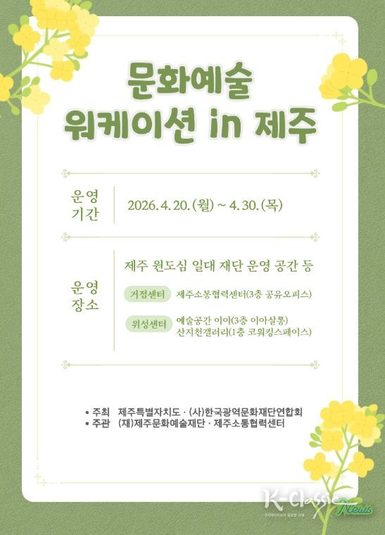 K-Classic News 기자 | 제주특별자치도와 한국광역문화재단연합회가 주최하고 제주문화예술재단(이사장 김석윤)이 주관하는 2026년 ‘문화예술 워케이션 in 제주’ 1차 프로그램이 오는 20일부터 4월 30일까지 운영된다.