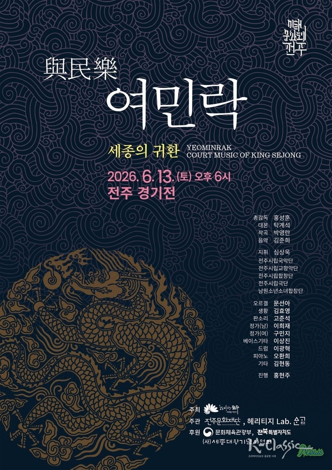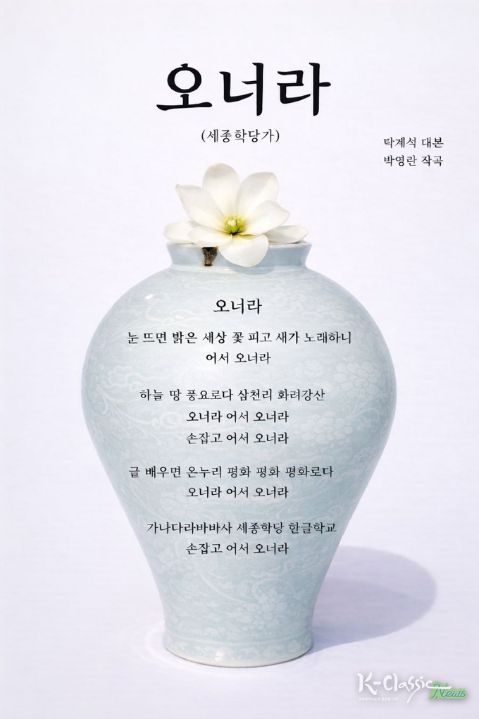 훈민정음 반포 580주년, 한글날 제정 100주년 기념, 이 역사적인 해를 맞아 세종대왕께서 창제하신 한글의 정신과 음악적 유산을 오늘의 감각과 소통에 맞게 재해석한 '세종의 귀환 여민락’을 오는 6월 13일 전주 경기어전에서 올리게 된 것을 매우 뜻깊고 기쁘게 생각합니다. 이러한 마음을 담아 세종학당가 ‘오너라’를 창작하게 되었습니다.