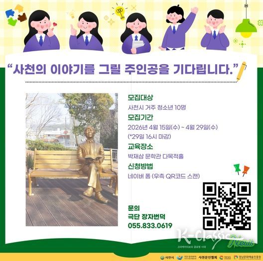 K-Classic News 기자 | 사천시, 사천문인협회, 극단 장자번덕은 4월 29일까지 지역 청소년을 대상으로 문화예술교육 '내 마음의 삼천포, 박재삼을 그리다'의 참가자를 모집한다고 19일 밝혔다.