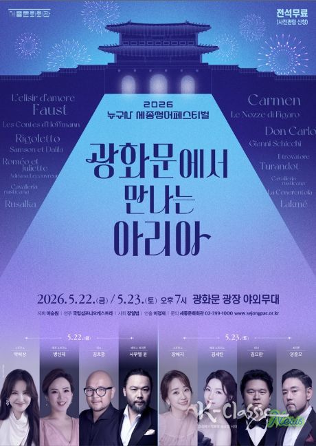 K-Classic News 기자 | 세종문화회관은 서울시민 누구나 즐길 수 있는 세종 썸머 페스티벌 '광화문에서 만나는 아리아'를 오는 5월 22일과 23일, 양일간 광화문 광장에서 개최한다. 광화문 광장은 시민 중심의 공간으로 새롭게 거듭난 이후 서울을 대표하는 문화 명소로 자리해 왔으며, 그 중심에서 세종문화회관은 한국 문화예술을 상징하는 공간으로 자리해 왔다. 이러한 공간적 맥락 속에서 세종문화회관과 광화문 광장은 문화의 전통성과 동시대성을 함께 품은 열린 문화예술 플랫폼으로 그 의미를 확장해가고 있다.