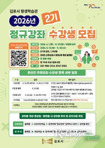 K-Classic News 기자 | 김포시가 시민의 평생학습 참여 기회를 확대하고 변화하는 사회 환경에 대응할 수 있는 역량 강화를 위해 ‘2026년 2기 평생교육 정규강좌’ 수강생을 모집한다고 밝혔다.