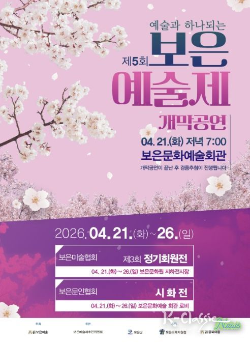 K-Classic News 기자 | 충북 보은군은 지역 예술인과 군민이 문화로 소통하고 화합하는 ‘제5회 보은예술제’를 21일부터 26일까지 6일간 보은문화예술회관 및 보은문화원 일원에서 개최한다고 밝혔다.