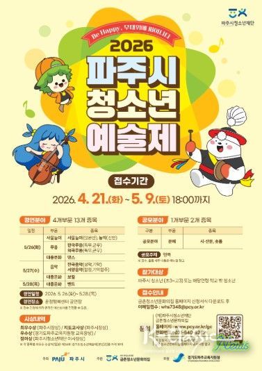 K-Classic News 기자 | (재)파주시청소년재단 금촌청소년문화의집은 오는 4월 21일부터 5월 9일까지 ‘2026 파주시청소년예술제’ 참가자를 모집한다고 밝혔다. 올해‘Be Happy, 무대위에 피어나다’를 부제로 개최되는 이번 예술제는 제34회 경기도청소년예술제 파주시 공식 예선으로, 파주시 청소년이라면 누구나 참가 신청이 가능하다.