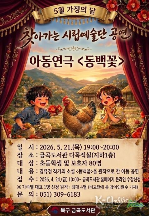 K-Classic News 기자 | 부산 북구는 오는 5월 21일 저녁 7시, 5월 가정의 달을 맞아 금곡도서관에서 지역 주민을 대상으로 김유정 작가의 단편소설 ‘동백꽃’을 원작으로 한 아동연극 공연을 개최한다고 밝혔다.