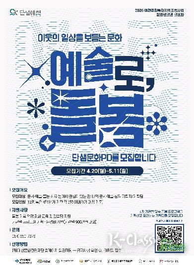 K-Classic News 기자 | (재)예천문화관광재단이 문화특화지역조성사업의 일환으로 진행되는 '예술로, 돌봄' 사업에 참여할 주민 문화기획자‘단샘문화PD’를 모집한다.