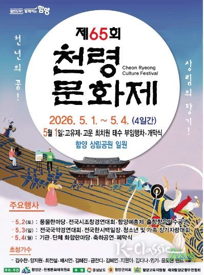 K-Classic News 기자 | 함양군을 대표하는 종합문화축제 ‘제65회 천령문화제’가 오는 5월 1일부터 4일까지 4일간 천년의 숲 상림공원 일원에서 열린다.