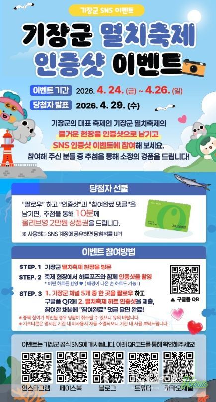 이번 이벤트는 기장군을 대표하는 축제인 기장멸치축제를 찾는 관광객들이 보다 즐겁게 축제를 체험하고, 기장군 공식 SNS 채널을 통해 군정 소식을 보다 친근하게 접할 수 있도록 기획됐다.