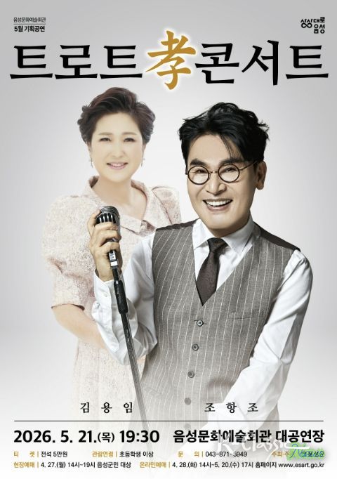 K-Classic News 기자 | 음성군은 사랑과 감사의 달 5월을 맞아 따뜻한 위로와 즐거움을 선사할 '트로트 孝 콘서트'를 오는 5월 21일 오후 7시 30분 음성문화예술회관에서 개최한다.