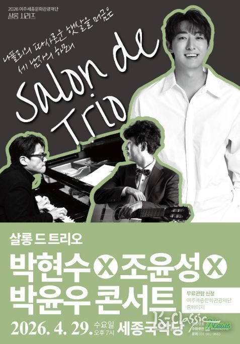 K-Classic News 기자 | 여주세종문화관광재단이 오는 29일, 문화가 있는 날을 맞아 2026년 특별기획 살롱 시리즈의 세 번째 무대 '살롱 드 트리오 박현수X조윤성X박윤우 콘서트'를 세종국악당에서 개최한다.