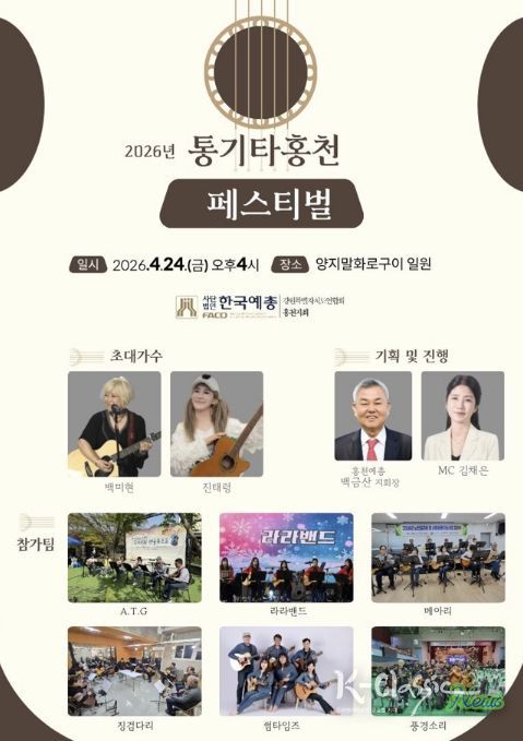 K-Classic News 기자 | (사)한국예총 홍천지회가 주관하는 2026 통기타 홍천 페스티벌이 오는 4월 24일 오후 4시 홍천 양지말화로구이 일원에서 열린다.