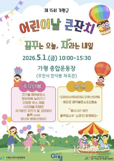 K-Classic News 기자 | 가평군은 오는 5월 1일 오전 10시 가평종합운동장에서 ‘제15회 가평군 어린이날 기념행사’를 개최한다. 가평군어린이집연합회와 가평군육아종합지원센터가 공동 주관하는 이번 축제는 기념행사와 공연, 놀이, 체험 부스 등 다채로운 프로그램으로 꾸며진다.