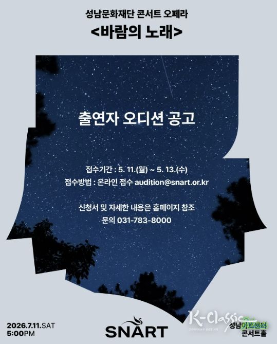오디션은 5월 19일 오후 2시부터 성남아트센터 콘서트홀에서 피아노 반주에 맞춘 지정곡 가창으로 진행되며, 합격자는 5월 22일 발표될 예정이다. 선발된 성악가는 연습을 거쳐 오는 7월 11일, 본 공연 무대에 오르게 된다. 오디션 관련 자세한 사항은 성남문화재단 홈페이지를 참고하거나, 성남문화재단 공연기획부로 문의하면 된다.
