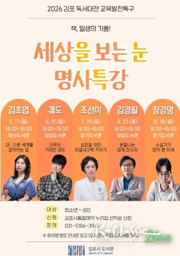 K-Classic News 기자 | 김포시 도서관은 2026 김포 독서대전 교육발전특구 사업으로 '세상을 보는 눈, 명사특강'을 오는 5월 17일부터 10월 18일까지 5회에 걸쳐 관내 도서관 3곳에서 진행한다.