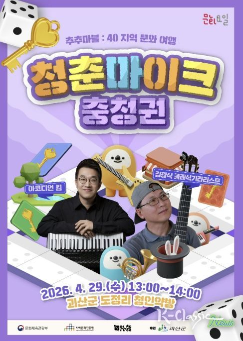 K-Classic News 기자 | 충북 괴산군은 지역 공간과 함께하는 거리공연 ‘청춘마이크’가 오는 29일과 5월 3일 두 차례에 걸쳐 개최된다고 밝혔다.