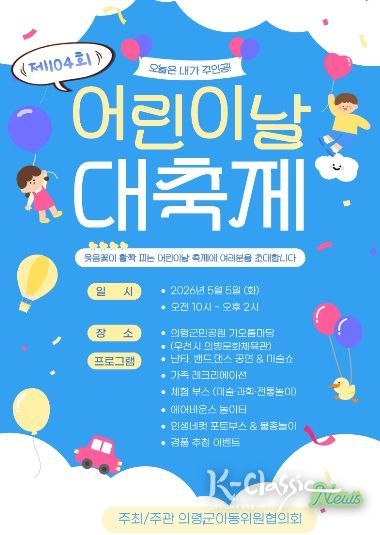 K-Classic News 기자 | 의령군은 다음달 5일 제104회 어린이날을 맞아 의령군민공원 기오름마당에서 ‘제104회 의령군 어린이날 대축제’를 개최한다고 밝혔다. 이번 행사는 의령군아동위원협의회가 주관한다.