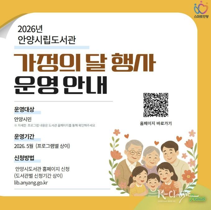 K-Classic News 기자 | 안양시도서관은 5월 가정의 달을 맞아 어린이와 부모가 함께하는 체험프로그램, 가족공연, 인문학 강연, 생활문화 강좌, 전시 등 다양한 행사를 마련했다.