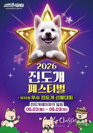 K-Classic News 기자 | 진도군이 오는 5월 2일부터 3일까지 이틀간 진도개테마파크에서 ‘진도개의 고향, 진도개테마파크에서의 만남’을 주제로 ‘2026 진도개 페스티벌’과 ‘제30회 우수 진도개 선발대회’을 동시에 개최한다.