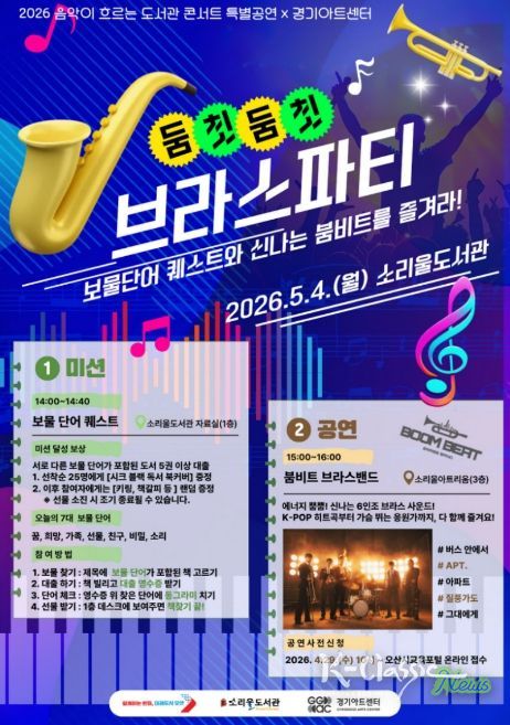 K-Classic News 기자 | 오산시 소리울도서관은 제104회 어린이날을 앞둔 오는 5월 4일 경기아트센터와 협업해 ‘2026 음악이 흐르는 도서관 콘서트’ 특별공연인 ‘둠칫둠칫 브라스 파티’를 개최한다고 밝혔다.