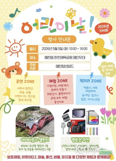 예천군 관계자는 “어린이날은 어린이가 존중받고 사랑받아야 할 소중한 날”이라며 “아이들이 마음껏 뛰놀고, 가족이 함께 웃을 수 있는 안전하고 즐거운 행사가 되도록 준비에 최선을 다하겠다”고 말했다.