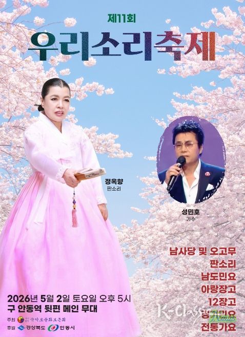 K-Classic News 기자 | 사단법인 국악로문화보존회가 주최․주관하는 '제11회 우리소리 축제'가 오는 5월 2일 오후 5시 안동 탈춤공원 무대에서 개최된다.
