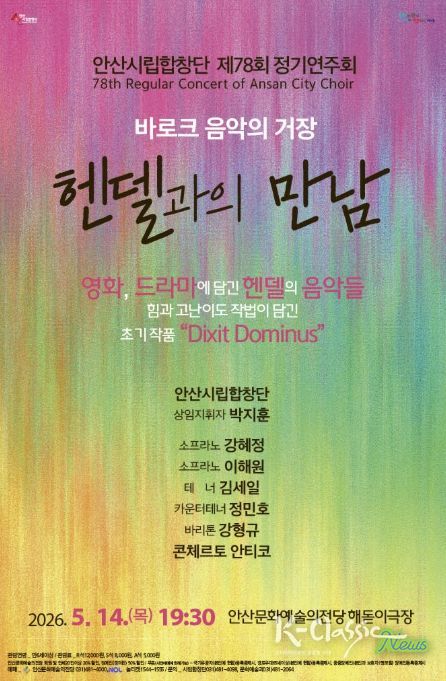 K-Classic News 기자 | 안산시는 내달 14일 오후 7시 30분 안산문화예술의전당 해돋이극장에서 안산시립합창단 제78회 정기연주회 '헨델과의 만남'을 개최한다고 29일 밝혔다.