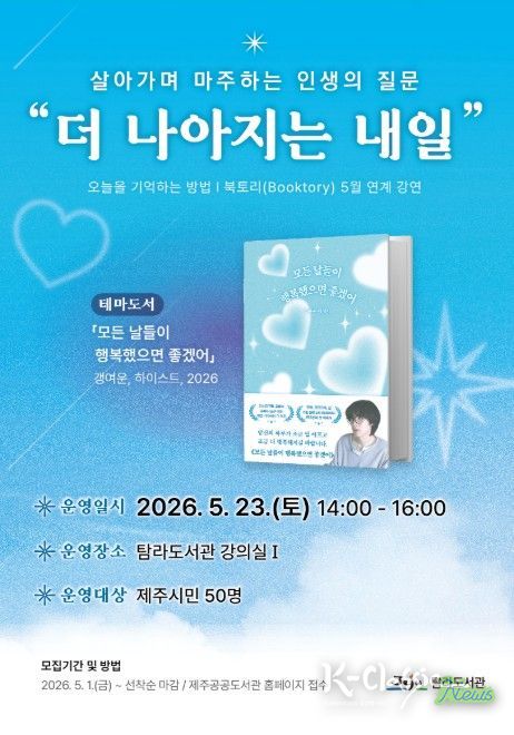 K-Classic News 기자 | 제주시 탐라도서관은 삶과 글을 통해 현대인의 일상 속에서 행복을 발견하고, 스스로를 돌보는 방법을 제시하기 위해 5월 북토리 강연을 운영한다.