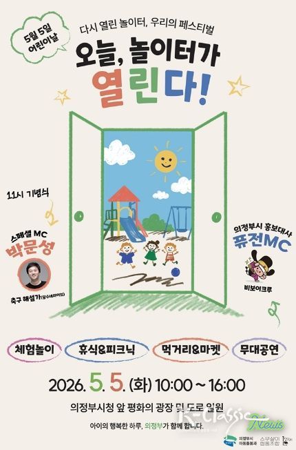 K-Classic News 기자 | 의정부시는 제104회 어린이날을 맞아 5월 5일 오전 10시부터 오후 4시까지 의정부시청 앞 평화의 광장 및 도로 일원에서 ‘2026년 의정부시 어린이날 기념행사’를 개최한다.