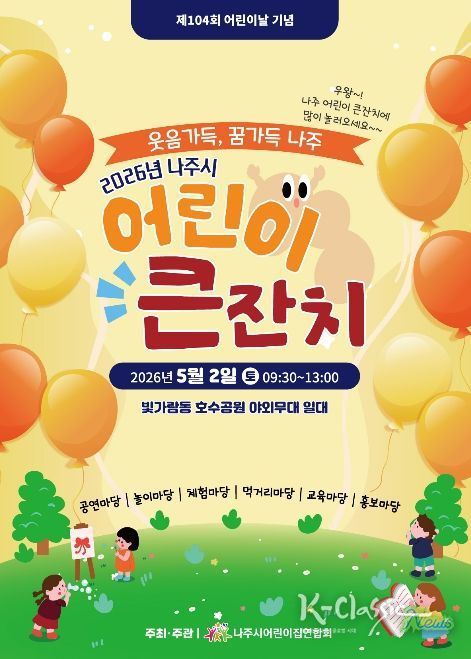 나주시는 오는 5월 2일 오전 9시 30분부터 빛가람호수공원 야외무대 일원에서 나주시어린이집연합회 주최로 ‘2026년 나주시 어린이 큰잔치’를 개최한다고 29일 밝혔다.