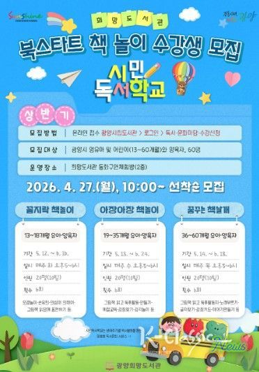 K-Classic News 기자 | 광양희망도서관은 ‘2026년 상반기 시민독서학교’의 일환으로 영유아 대상 ‘북스타트 책놀이’ 프로그램 수강생을 모집하고 있다.