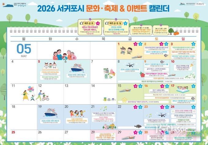 서귀포시는 5월 행사가 어린이날, 가정의 달, 도민체전, 읍면동 축제와 맞물려 있는 만큼 시민과 관광객이 주요 일정을 쉽게 확인할 수 있도록 행사 정보를 캘린더로 통합 안내할 예정으로, 방문 흐름이 원도심과 관광지, 읍면동 상권으로 이어질 수 있도록 할 방침이다.