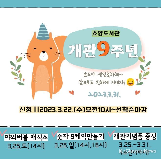 도서관은 이번 개관 9주년을 맞아 기념행사로 △야외 버블 매직쇼 △효양 9주년 축하케이크 만들기△9주년 축하 기념품 증정 등 다채로운 행사를 마련했다.