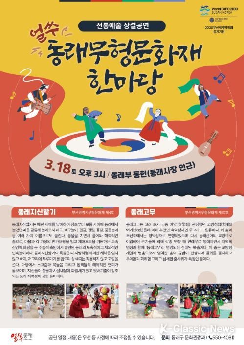 K-Classic News 최지나 기자 | 부산 동래구는 오는 3월 18일 오후 3시부터 동래부 동헌 마당에서 ‘얼쑤, 동래 무형문화재 한마당’을 공연을 개최한다고 밝혔다. 7월을 제외한 매월 셋째 주 토요일, 3월부터 11월까지 총 8회 개최할 예정이다.
