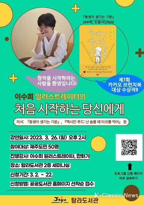 K-Classic News 최지나 기자 | 제주시 탐라도서관에서는 3월 26일 오후 2시 ‘처음 시작하는 당신에게’ 라는 테마로 이수희 일러스트레이터의 강연을 개최한다.