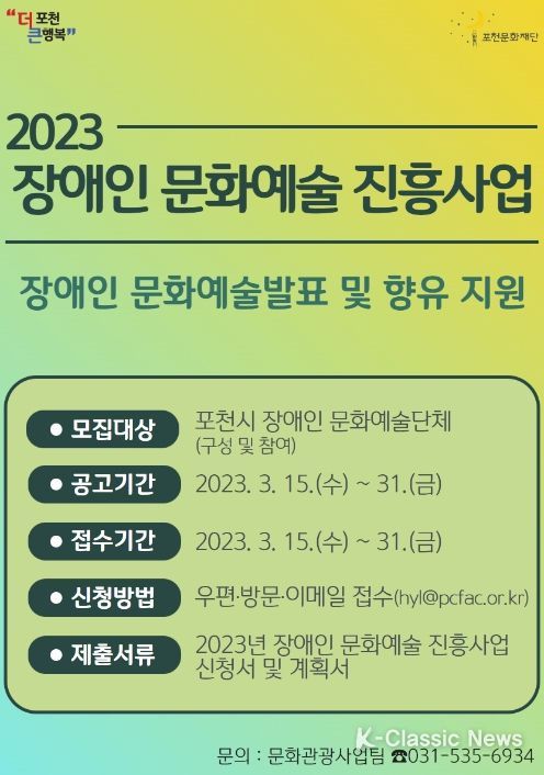 K-Classic News 최지나 기자 | 재단법인 포천문화재단은 장애인 문화예술 분야의 활성화와 권리 증진을 위한 ‘장애인 문화예술 진흥사업’ 공모를 통해 지원할 계획이다.