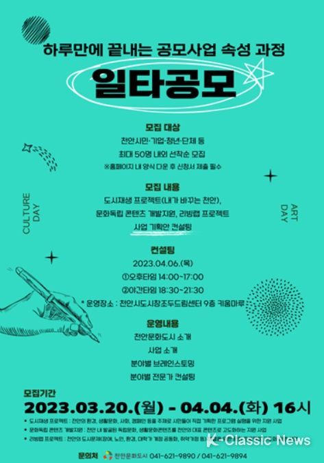 K-Classic News 최지나 기자 | 천안시와 충남정보문화산업진흥원 문화도시사무국이 공모사업을 대상으로 사전 컨설팅을 운영한다.