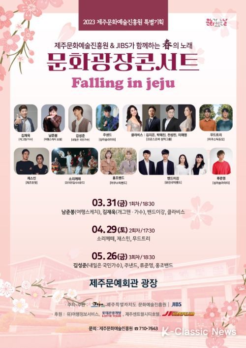 K-Classic News 최지나 기자 | 제주문화예술진흥원은 JIBS와 공동기획으로 봄의 노래 '문화광장콘서트 Falling in Jeju' ‘제주에 빠지다’란 주제로 제주문예회관 광장(우천시 문예회관 대극장 로비)에서 버스킹 콘서트를 펼친다.