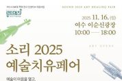 K-Classic News 기자 | 여수시는 오는 11월 16일 이순신광장에서 ‘소리 2025 예술치유페어’를 개최한다. 이번 행사는 ‘소리를 느끼고, 마음을 치유하다’를 주제로 음악·악기·미술 등 다양한 감각 기반 콘텐츠를 시민이 직접 체험하며 예술적 치유를 경험할 수 있도록 마련됐다. 단순 전시 중심의 행사에서 벗어나 공연·체험·전시를 결합해 도심의 문화적 활력과 시민 정서 회복에 기여할 수 있도록 기획됐다. 특히 지역 예술기업, 공예·악기팀 등 다양한 업체가 참여해 지역 기반의 예술 치유 네트워크를 형성하고 마이스 특화전시 사업의 취지인 지역 산업 및 예술기업과의 연계를 강화하는 계기가 될 전망이다. 행사장 내 ‘소리놀이터’에는 무대와 포토존이 운영되며 시간대별 프로그램이 진행된다. 오전 오프닝 체험을 시작으로 국악과 힐링 악기가 함께하는 특별 무대가 펼쳐지며 시민이 직접 악기를 시연해보는 관객 참여형 콘텐츠도 마련된다. 김상욱 여수시 관광과장은 “이번 ‘소리 2025 예술치유페어’는 시민의 심리적 안정과 문화 향유 기회 확대는 물론 여수 마이스 특화전시사업의 방향인 지역 예