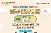 K-Classic News 기자 | 대구 남구는 지역 주민들에게 일상 속 문화 향유 기회를 확대하고, 지역 예술가들의 공연 활동을 지원하기 위해 ‘2026 찾아가는 문화공연’ 을 개최한다. 관내 신규 입주 공동주택을 대상으로 공연을 희망하는 아파트 단지를 선정하였으며, 오는 4월 14일(화) 앞산비스타동원 아파트에서 첫 공연을 진행할 예정이다. 저녁 7시에 열리는 ‘앞산비스타동원 음악회’에서는 인기 개그맨 김재롱이 사회를 맡고, 지역 가수 이새벽과 미스트롯 4 출연자 장혜리 가수가 공연을 펼친다. 또한, 아파트 입주 후 처음으로 열리는 주민 참여 행사인만큼 입주자 대표회에서도 다양한 경품과 선물을 준비하여 주민 화합의 장을 만들 예정이다. 조재구 남구청장은 “대규모 축제나 행사도 중요하지만, 주민들이 사는 가까운 동네에서 편하게 문화예술을 접할 수 있도록 찾아가는 문화행정을 적극 추진하겠다.”라며, “아파트로 찾아가는 음악회를 통해 주민들이 일상에서 소소한 행복을 느끼며 힐링할 수 있기를 바란다.”라고 전했다. ‘찾아가는 문화공연’에 대한 문의는 남구 문화관광과 문화예술팀으로 연락하면 안내받을 수 있다.