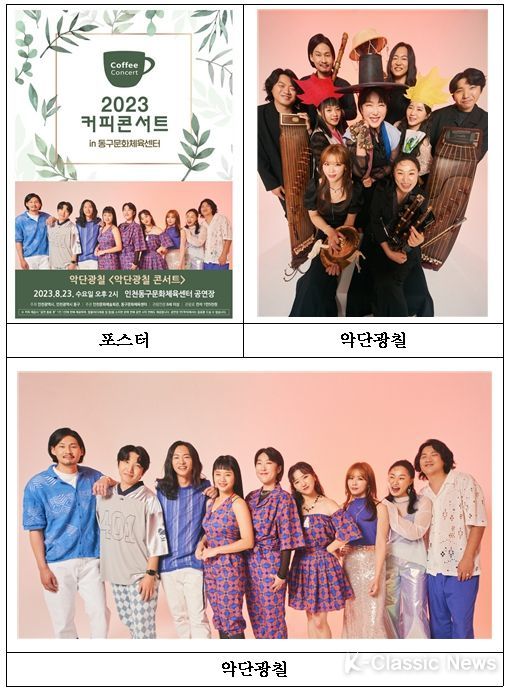 K-Classic News 기자 | 인천광역시는 인천문화예술회관 리모델링 공사로 7월부터 원도심인 동구로 장소를 옮겨 진행하는 커피콘서트의 두 번째 공연 K컬처의 대표주자 ‘악단광칠’의 무대가 오는 8월 23일 오후 2시 인천 동구문화체육센터 공연장에서 열린다고 밝혔다.