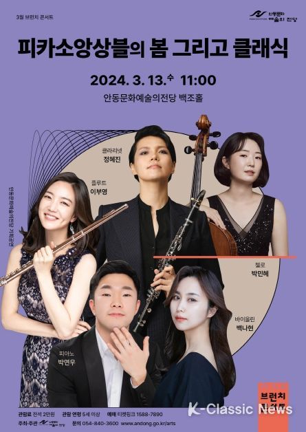 안동문화예술의전당 3월 브런치 콘서트 ‘피카소 앙상블의 봄 그리고 클래식’은 전석 2만 원으로 5세 이상 관람이 가능하며, 자세한 사항은 전화로 문의하거나 안동문화예술의전당 누리집에서 확인할 수 있다.